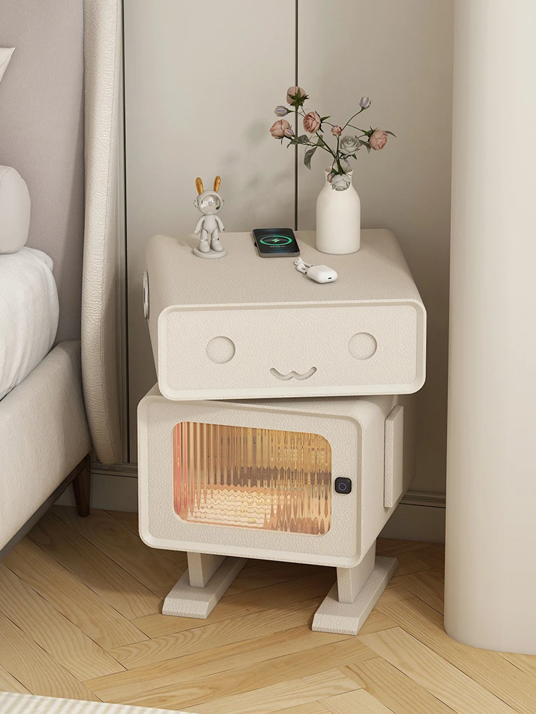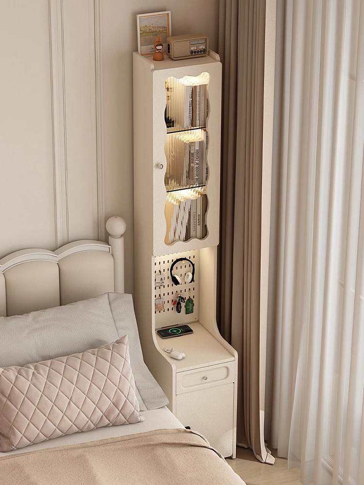 ラグジュアリー感あふれるクリームカラーベッドエンドキャビネット:環境に優しいフォーマルデヒドゼロの薄型高級ナイトテーブル!主寝室にぴったりのラウンドコーナーデザインで、スタイリッシュな雰囲気を演出します。