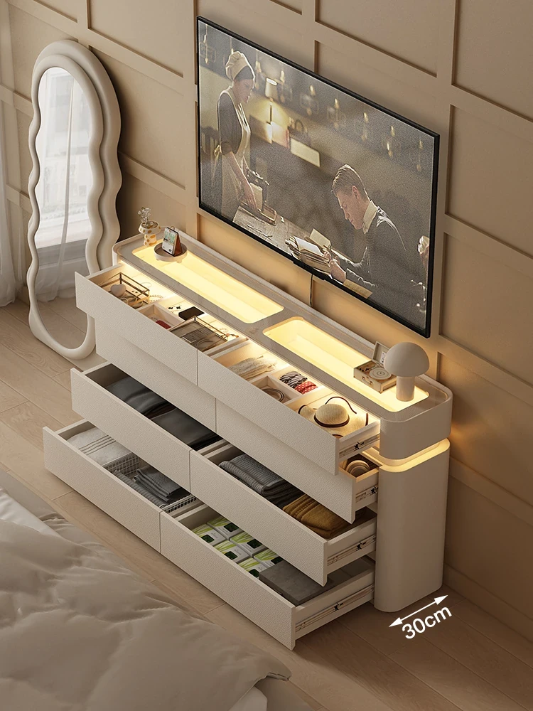 フランス風クリーム色の超薄型ガラスキャビネット - リビングルーム用、幅30CMのスリムデザイン!主寝室のベッドサイドテーブルやドレッサーとしても活躍する収納一体型です。お部屋をスタイリッシュに演出し、機能性も抜群!