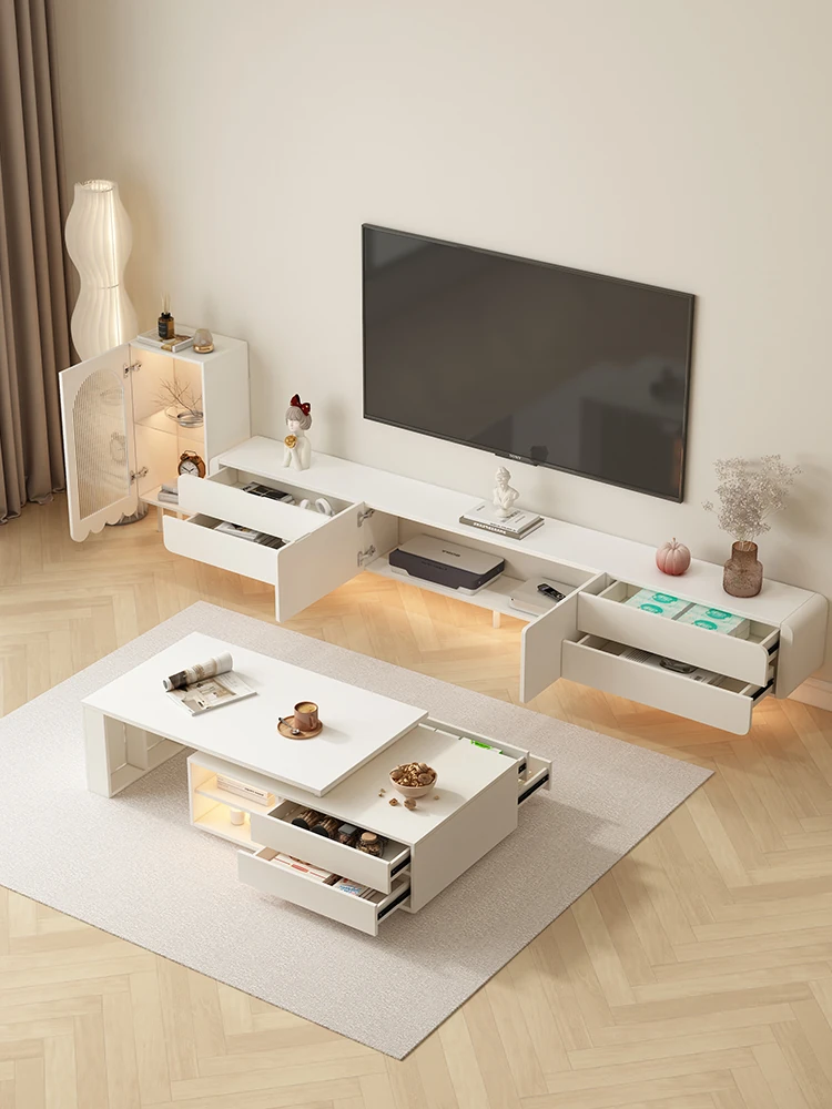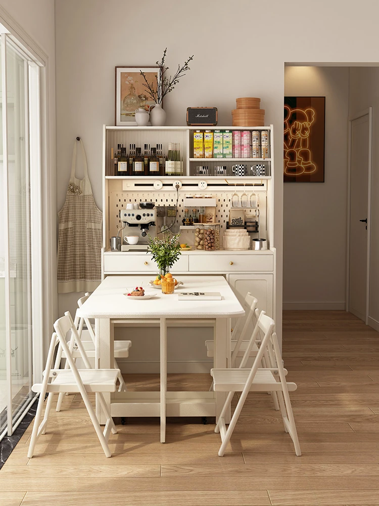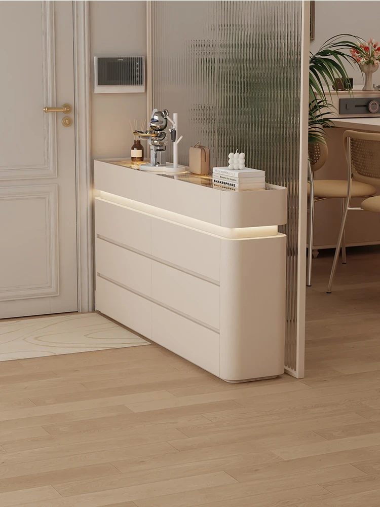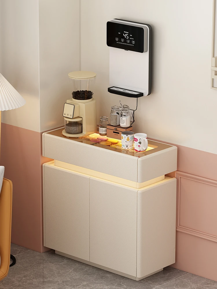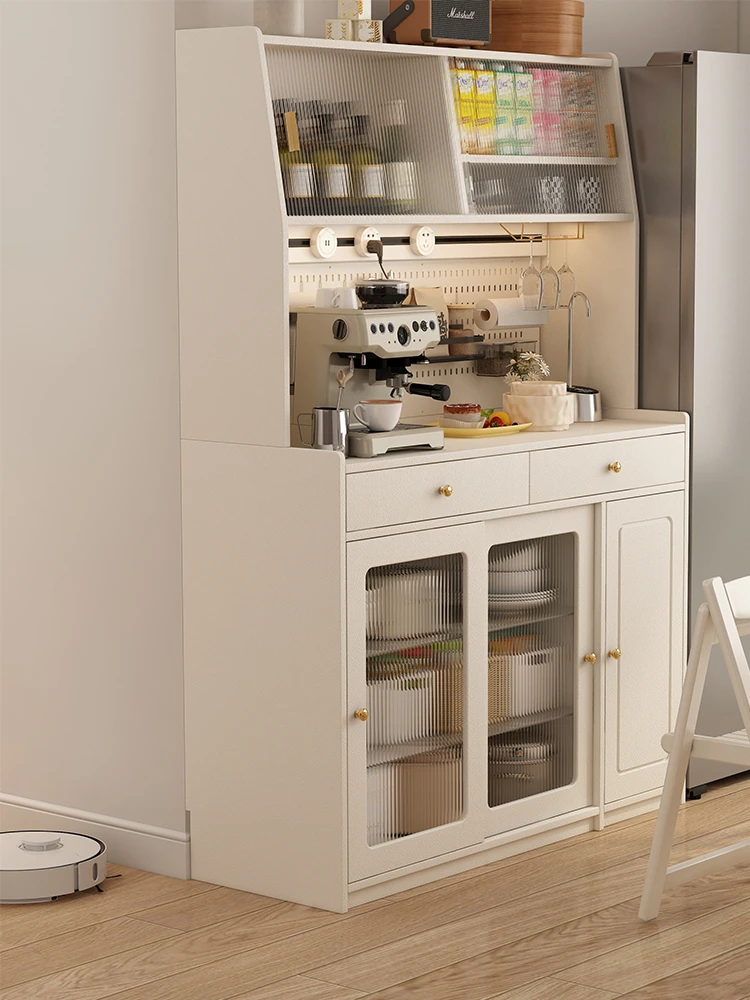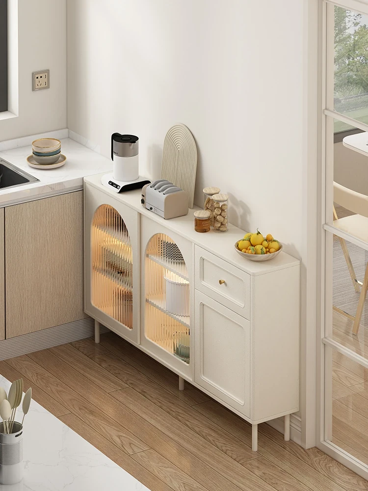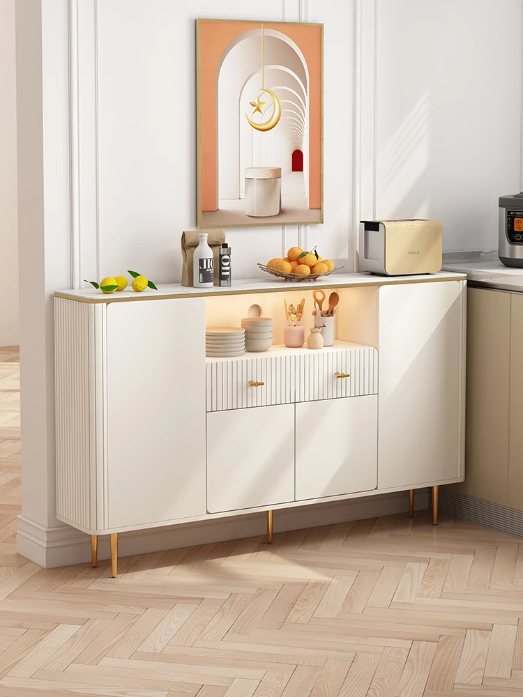 フランス風リビングルーム用のスタイリッシュな岩板サイドボード【高級クリームカラー】、壁にぴったりフィットする多機能キッチン収納キャビネット。酒棚やティーサーバー機能付きで、おしゃれで便利なお部屋を演出します!