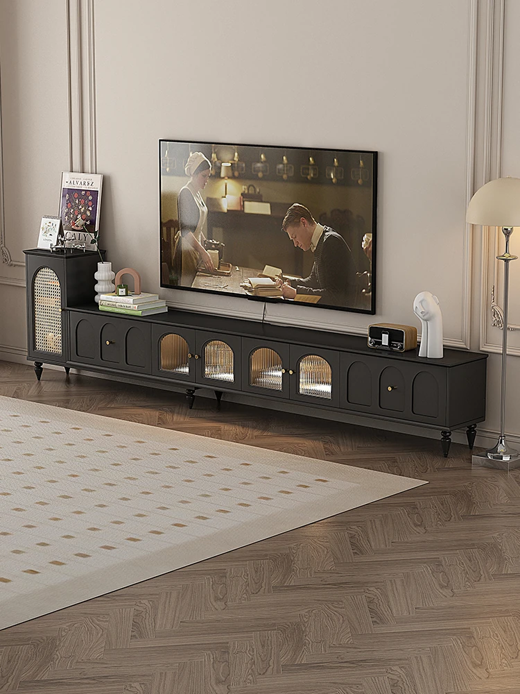 中古のブラック伸縮式テレビボード&ブックシェルフ一体型、小型リビングにぴったり!天然木脚付きで優れた収納力を持つテレビ収納キャビネット