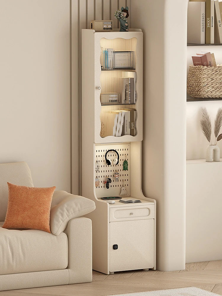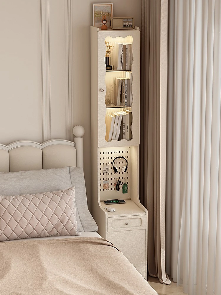 フレンチクリームスタイルの移動式リビングサイドキャビネット - 多機能収納棚で魅力的な空間を演出!ソファの横にぴったりの仕切り棚として、すっきりとした収納を実現。おしゃれで便利な収納アイテム。