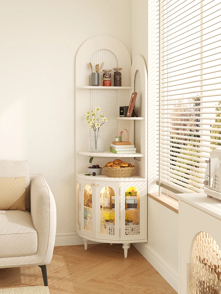 「フレンチスタイルのアール角収納キャビネット - 壁にピッタリフィットするおしゃれな三角形デザイン!リビングルームの隅に最適な実木製収納棚」で、空間を有効活用し、スタイリッシュな雰囲気を演出します!